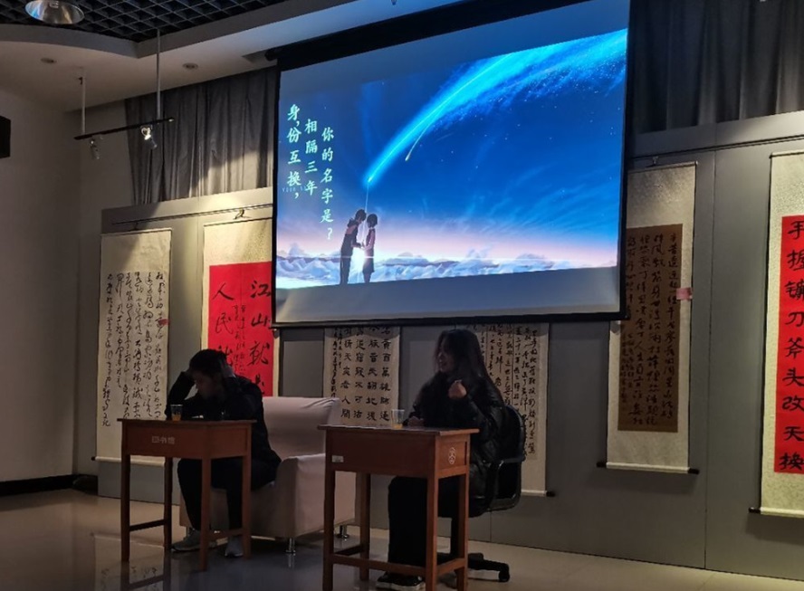 活动在两名同学表演《你的名字。》同名影片中的经典片段拉开序幕。两位同学惟妙惟肖的表演,引来阵阵掌声。伴着优美的电影插曲和灯光投影,主持人郑一鸣、何妙娟两位同学介绍了《你的名字。》主要内容,并播放了电影中的经典片段。