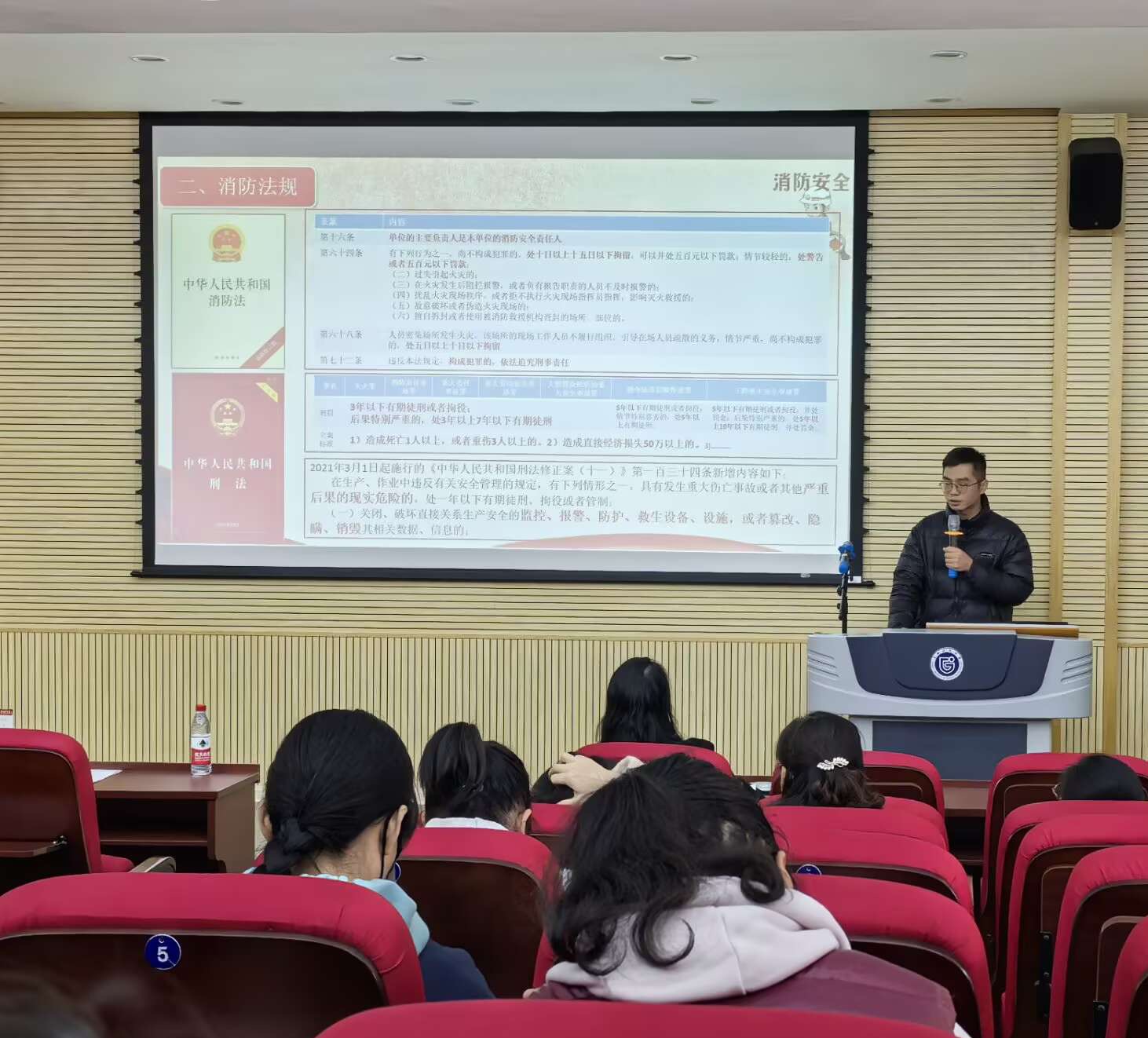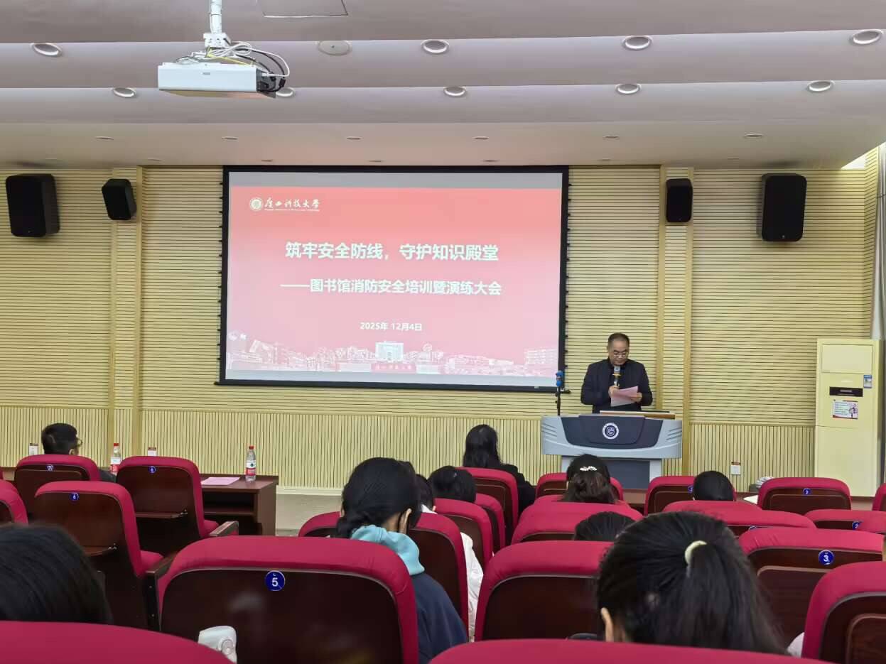 为进一步夯实图书馆全体馆员消防安全责任意识,提升突发火情应急处置能力,筑牢校园安全防线,2025年12月4日上午,我校图书馆联合保卫处在文昌校区举行消防安全培训暨实战演练大会。图书馆副馆长赵足娥主持活动,武装部副部长、保卫处副处长周武汉,保卫处消防专职管理员钟盛壮及图书馆全体馆员参加此次培训演练。